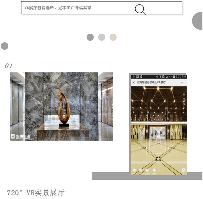 如今市场消费者注重购买体验,单一效果展示难以再满足客户高层次的需求。宏陶陶瓷结合全景VR技术,推出线上展厅,让客户足不出户,就可以将产品尽收眼底,还可以实现线上选购,感受宏陶陶瓷精工品质、精彩生活。